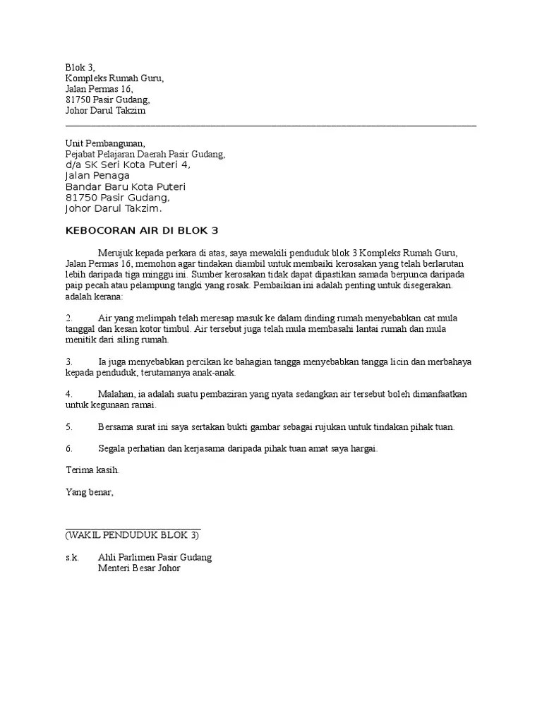 Contoh surat rasmi aduan kerosakan jalan raya surat rasmi b. Contoh surat rasmi berikut sebagai panduan kepada mereka yang ingin . Klik untuk memperluas informasi dokumen. Tuan aduan keselamatan dan kebersihan perumahan apartment seri kayangan lok kawi height. Scribd is the world s largest social reading and publishing site. Contoh surat aduan bagi masalah berkaitan alam sekitar di malaysia by bigoharazu in types > legal forms.